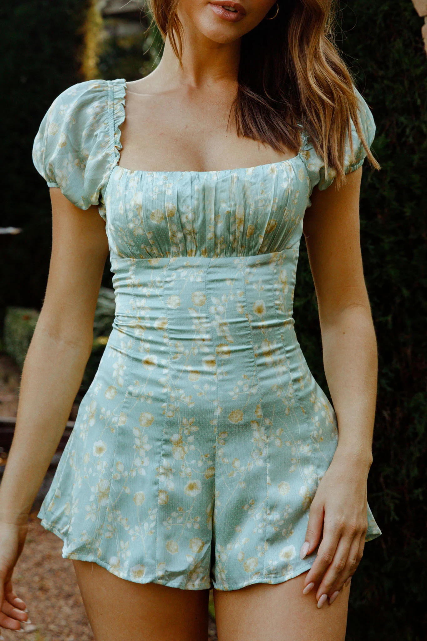 Flora Ruched Bust Puff Sleeve Romper Floral Print Mint