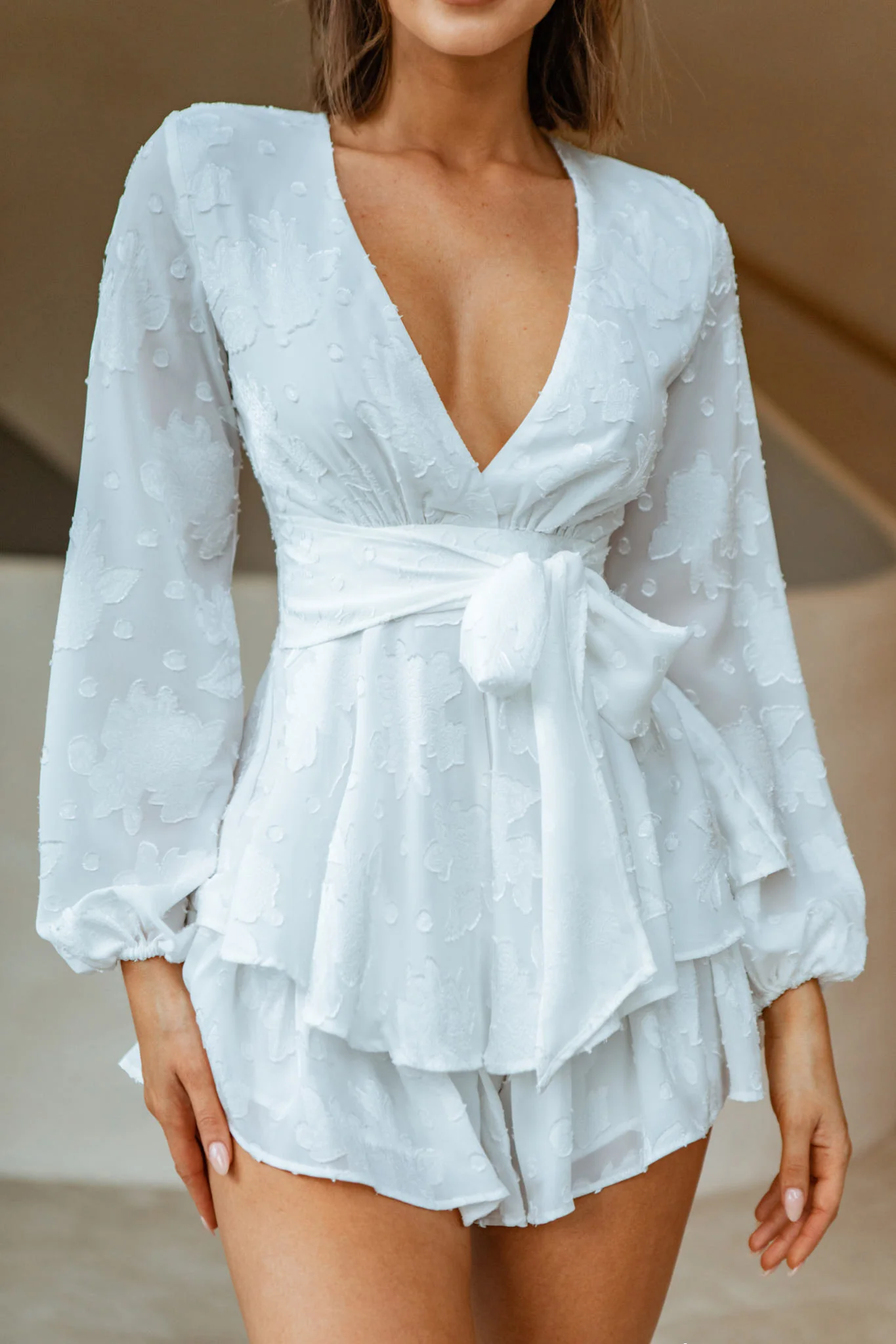Maddox Fit & Flare Long Sleeve Romper Textured Floral White