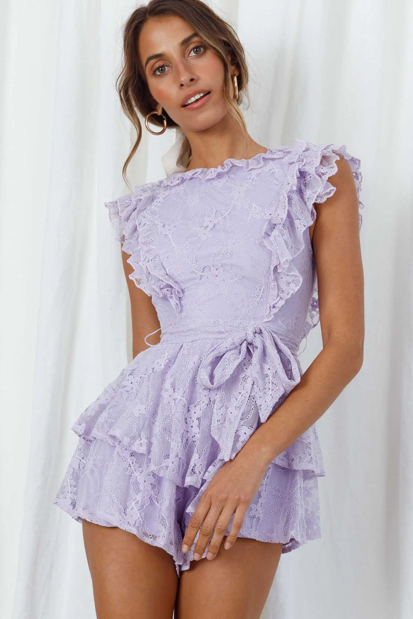 Spring Fling Frill Trim Waist Tie Lace Romper Lilac