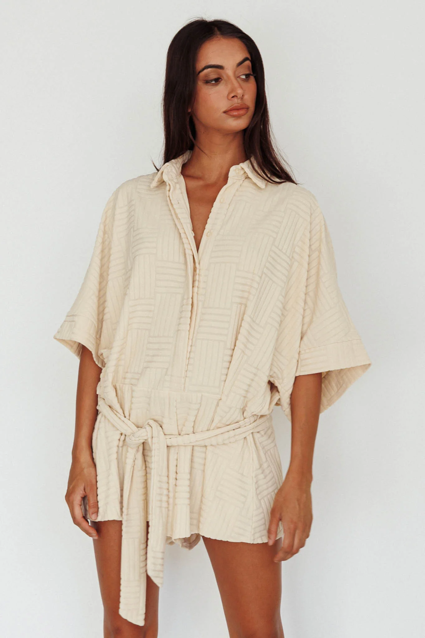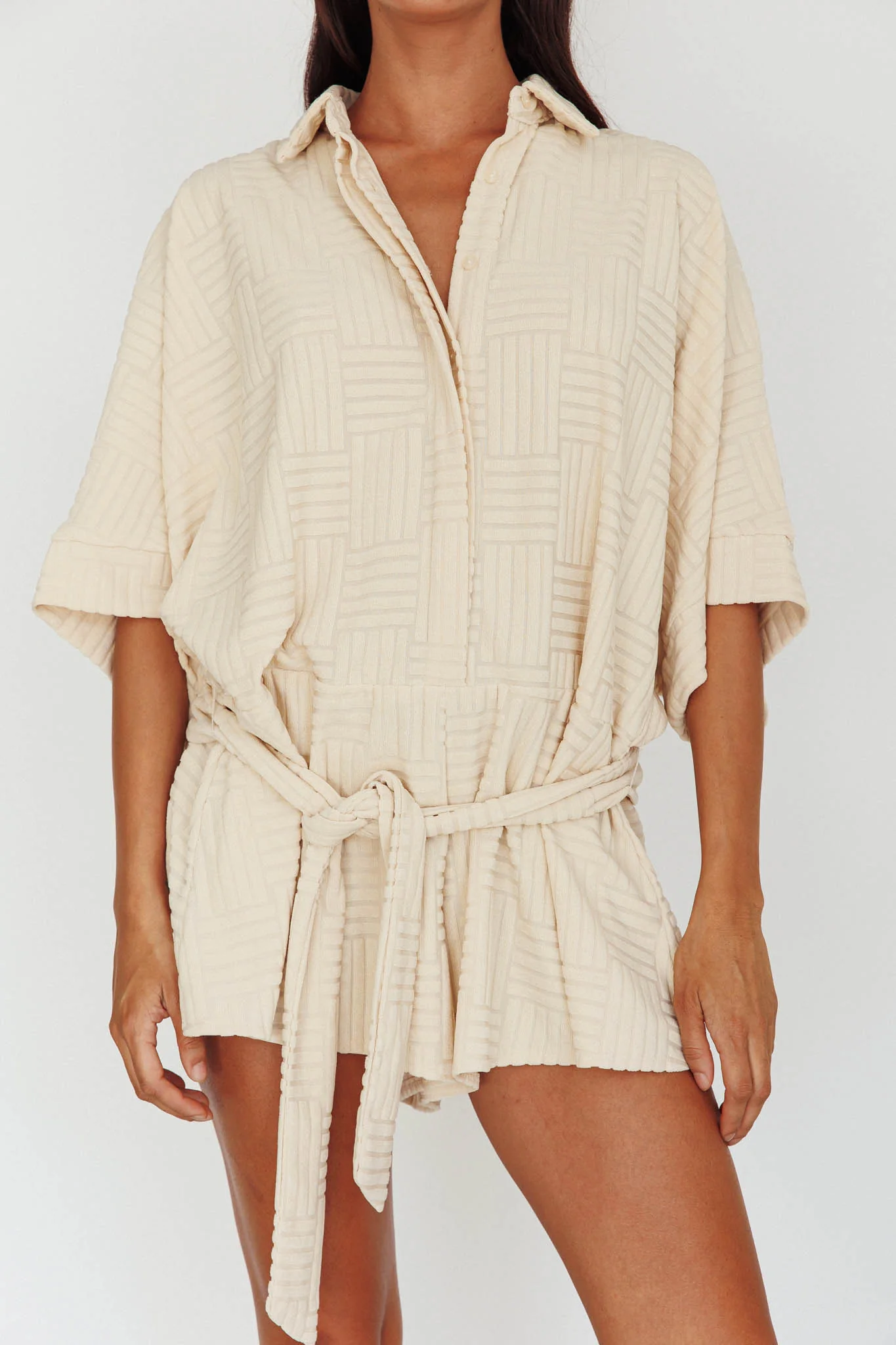 Daytona Beach Button-Up Romper Textured Beige