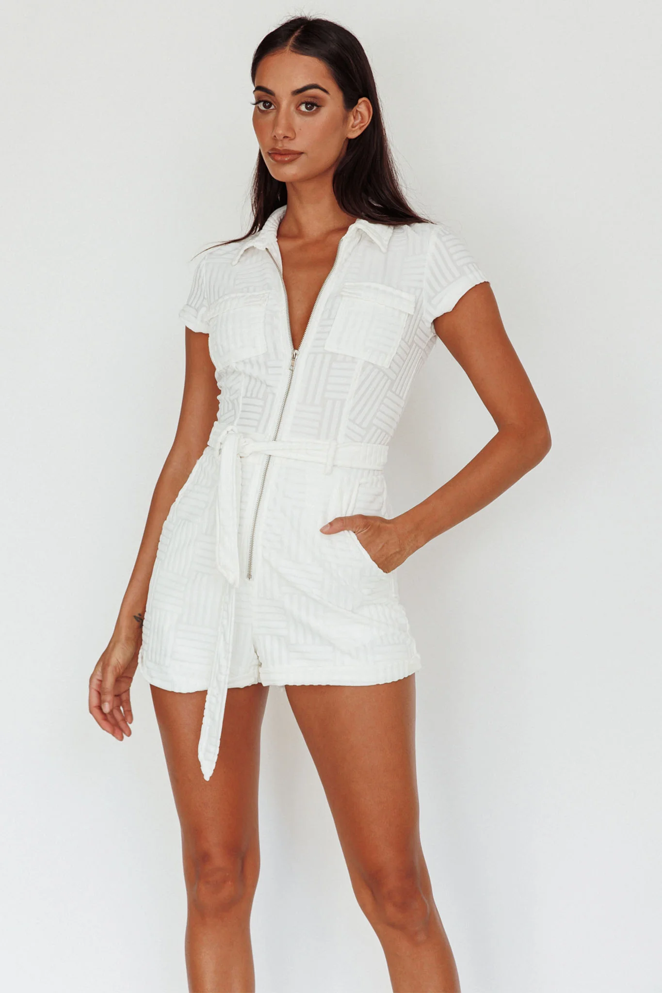 Daytona Beach Button-Up Romper Textured White