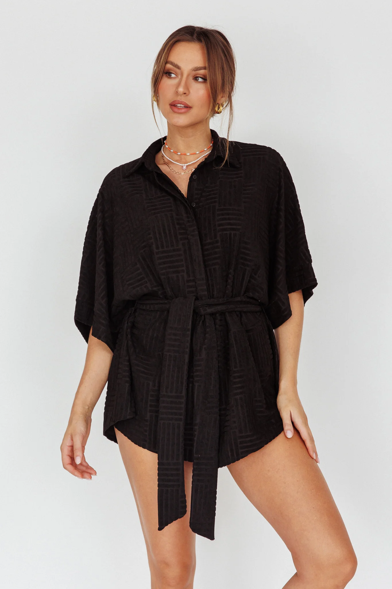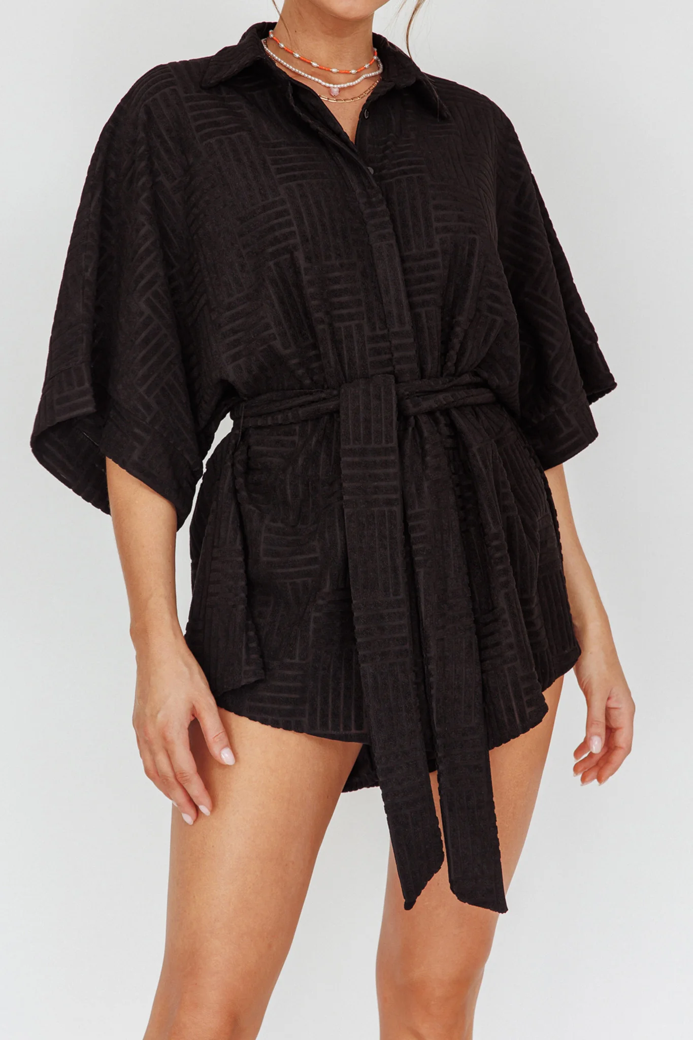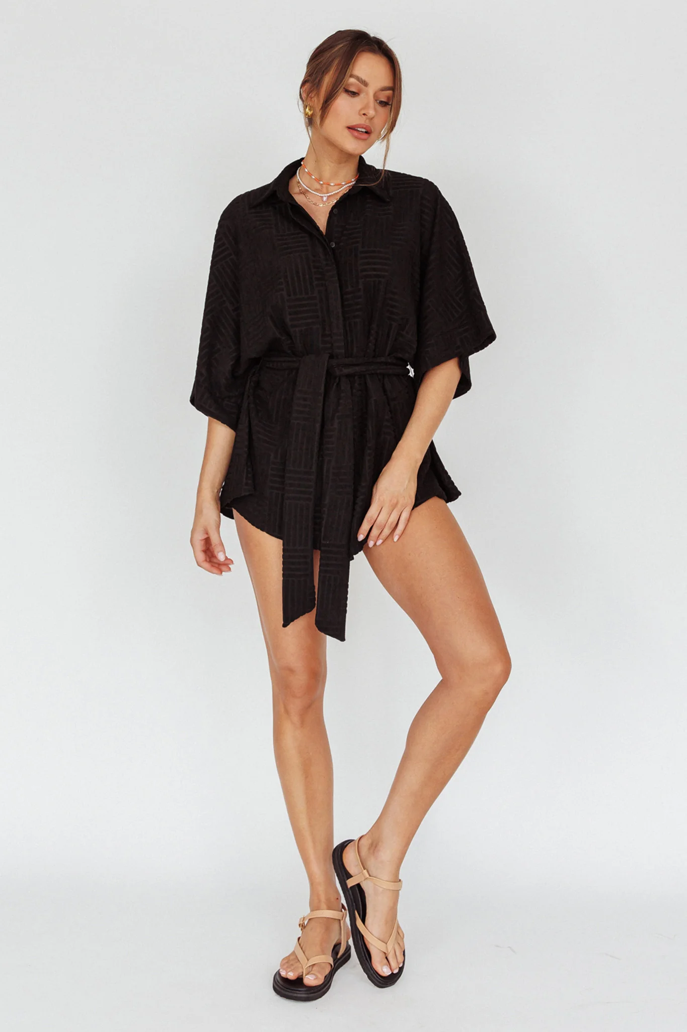 Daytona Beach Button-Up Romper Textured Black