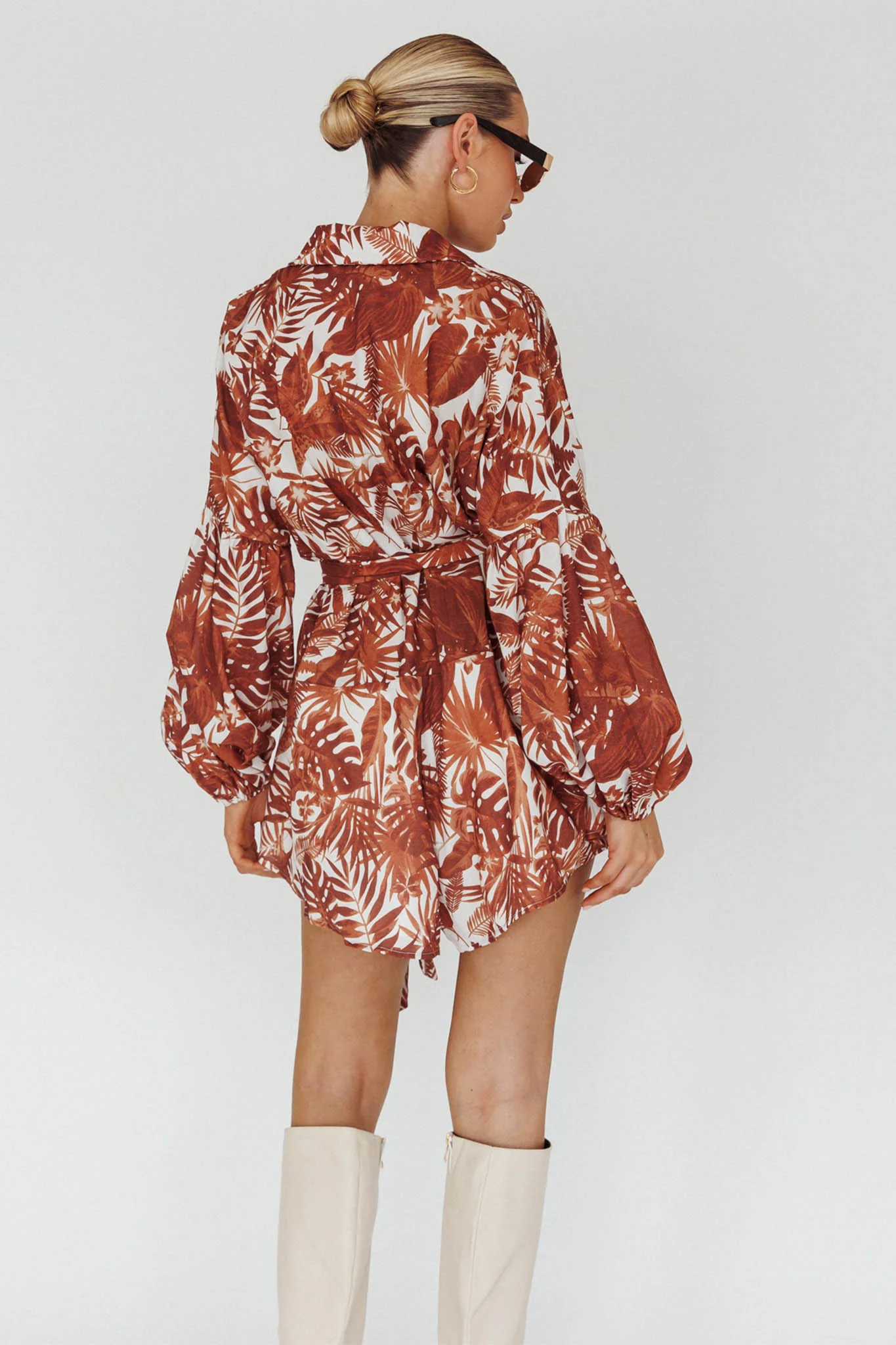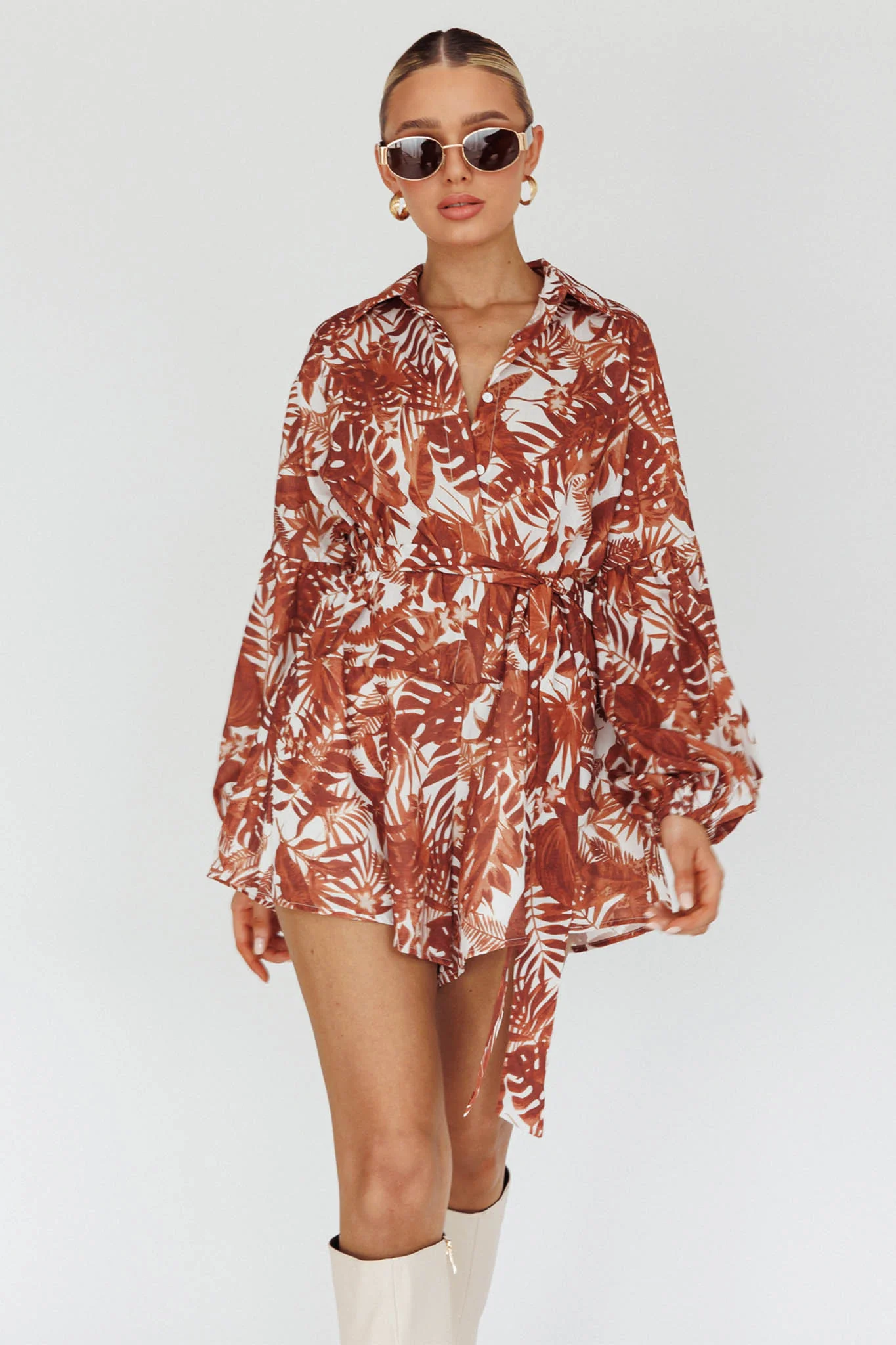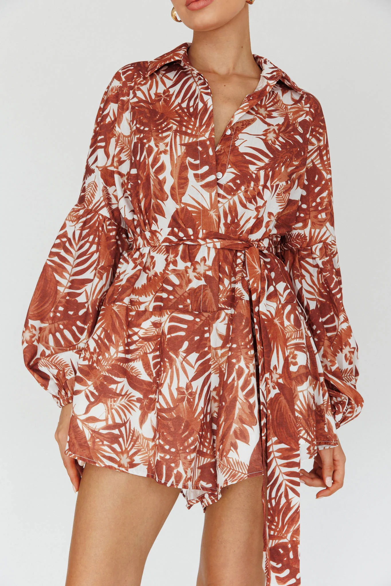 Daytona Beach Long Sleeve Shirt Romper Leaves Brown