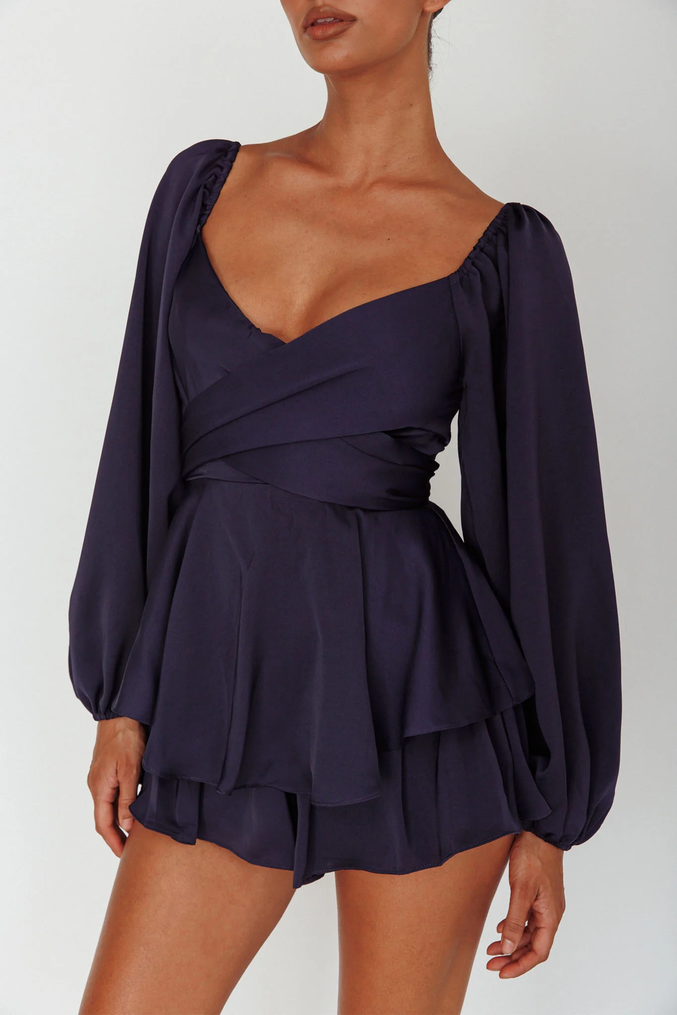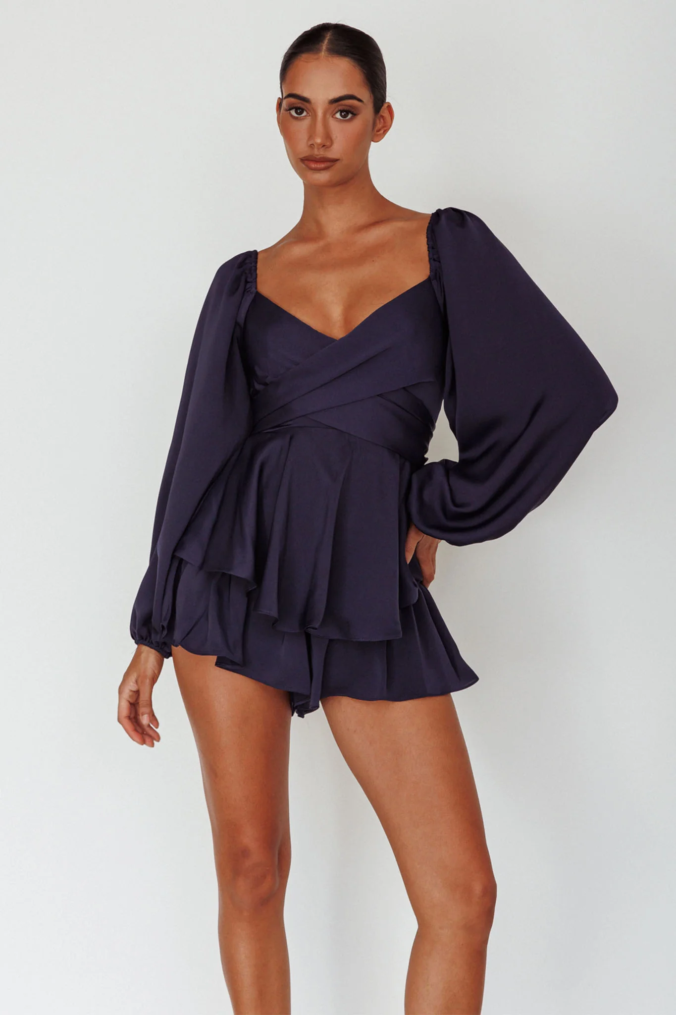 It's Complicated Long Sleeve Flounce Romper Navy