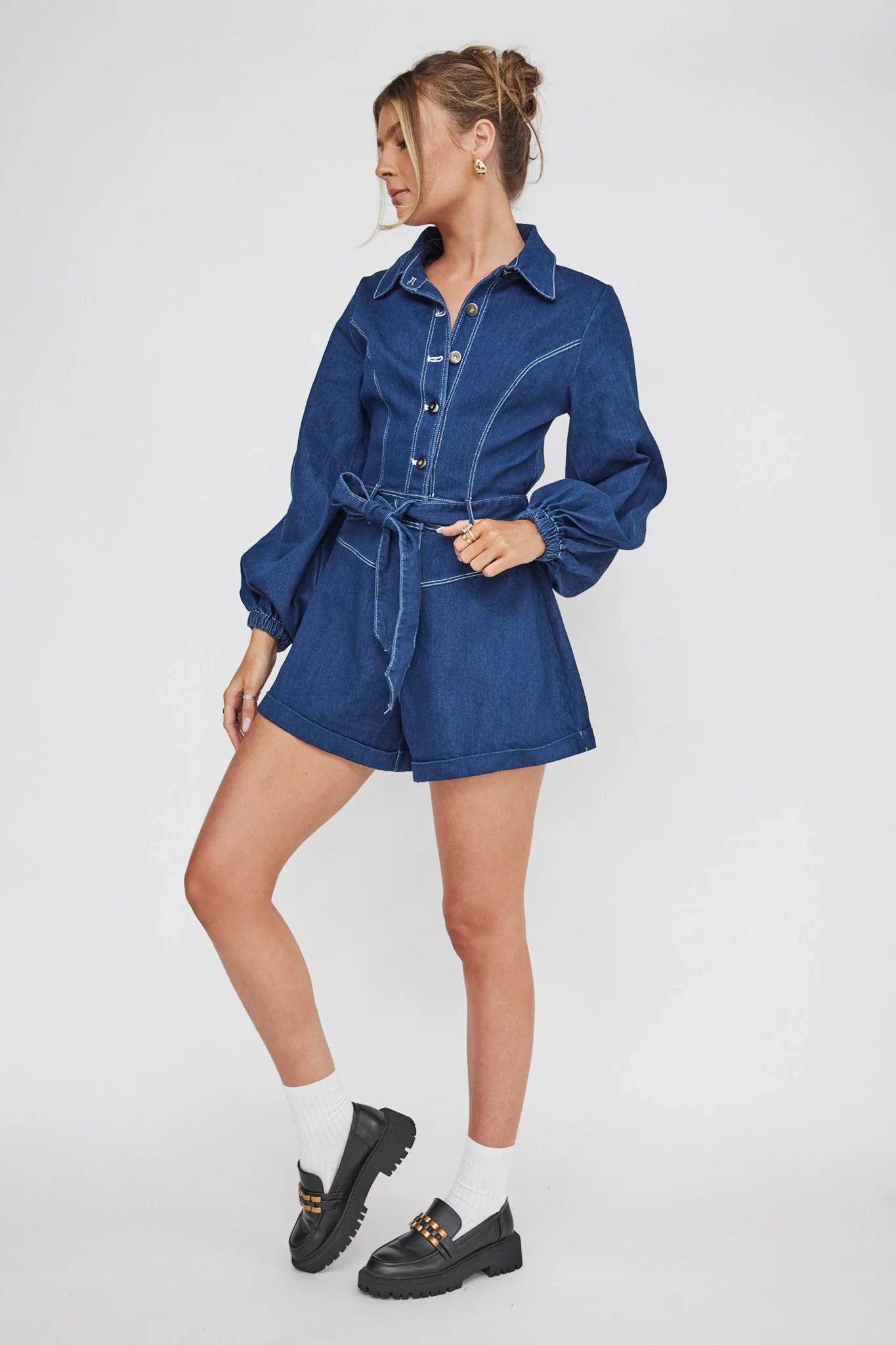 California Girl Short Sleeve Waist Tie Jumpsuit Denim Blue