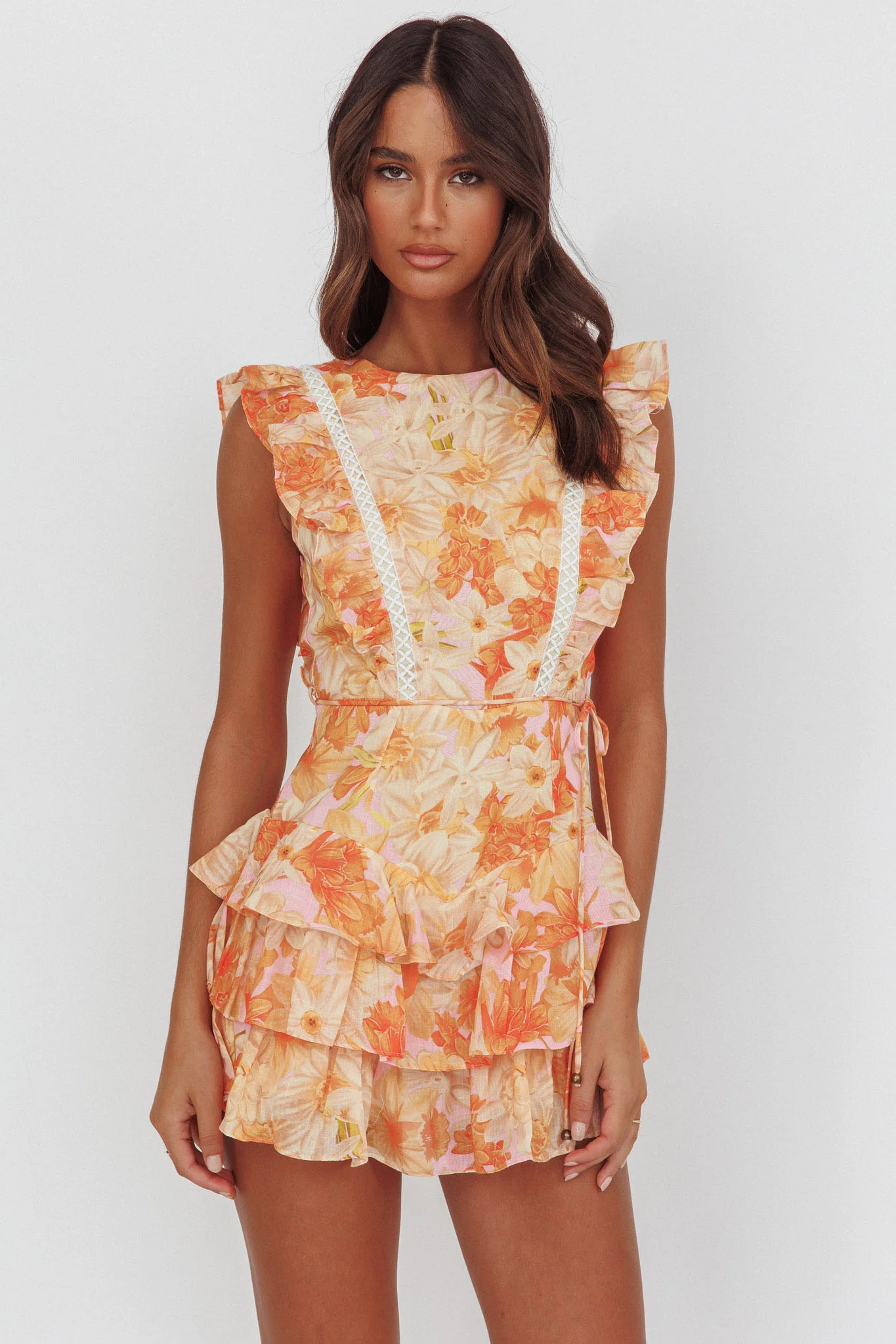 Weekend Muse Sleeveless Layered Frill Romper Flowers Yellow