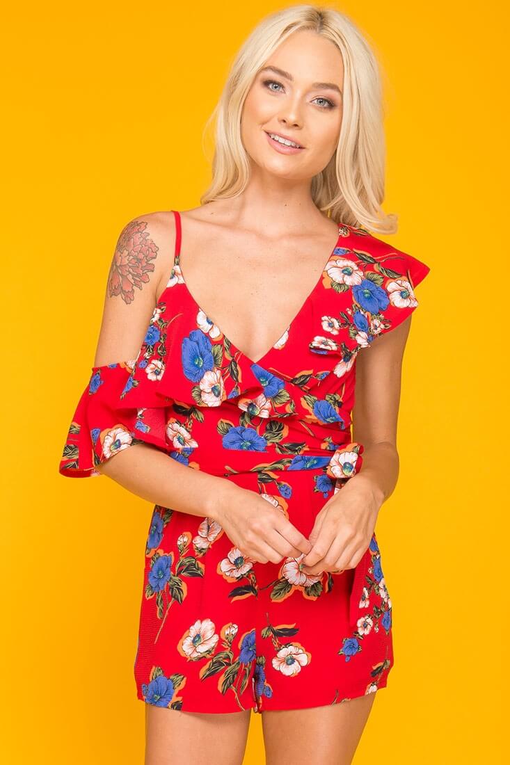 Daleyza Ruffled Floral Romper Red & Blue