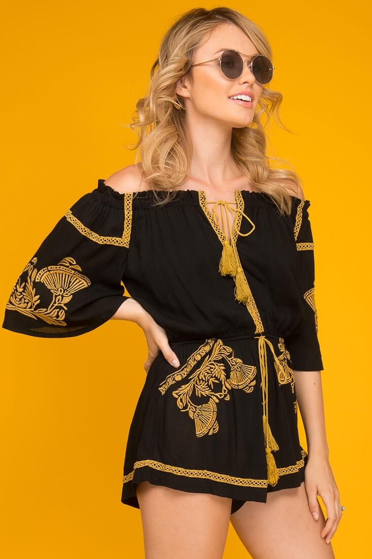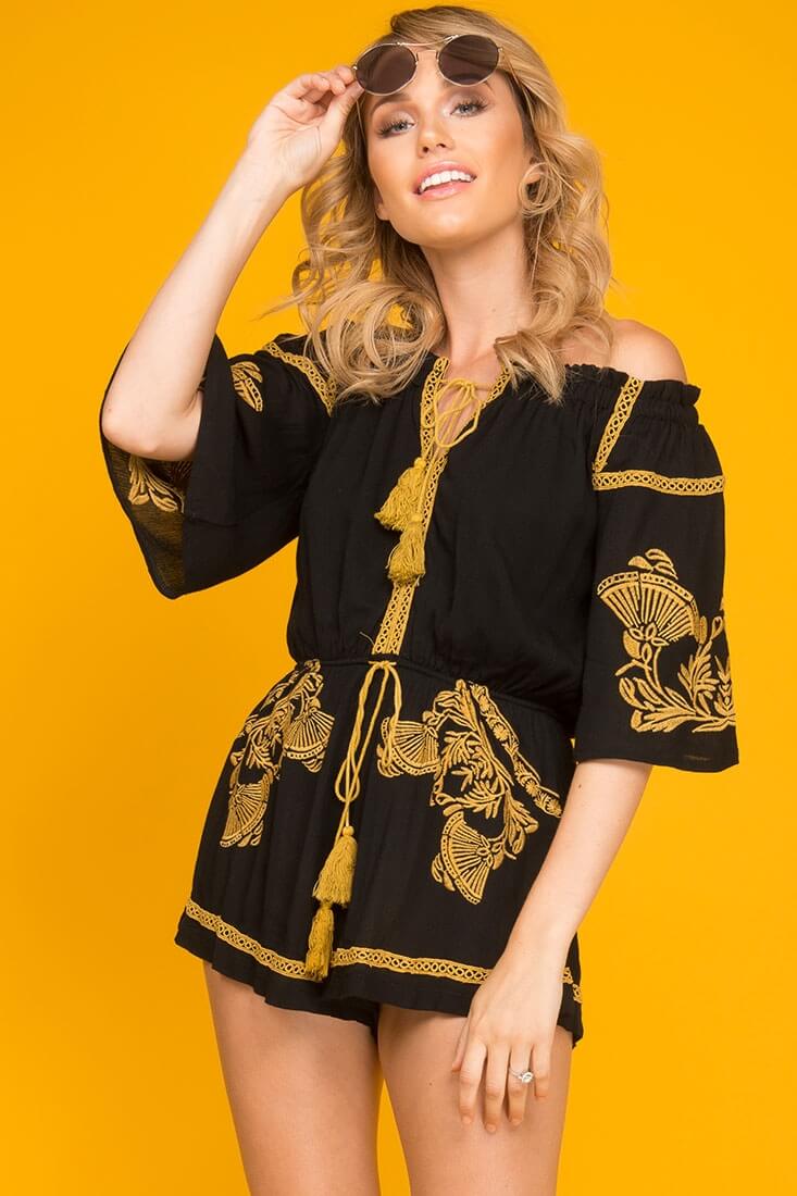 Gabriella Embroidered Tassel Romper Black