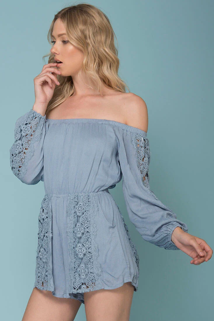 Eliana Off The Shoulder Lace Sleeve Romper Blue