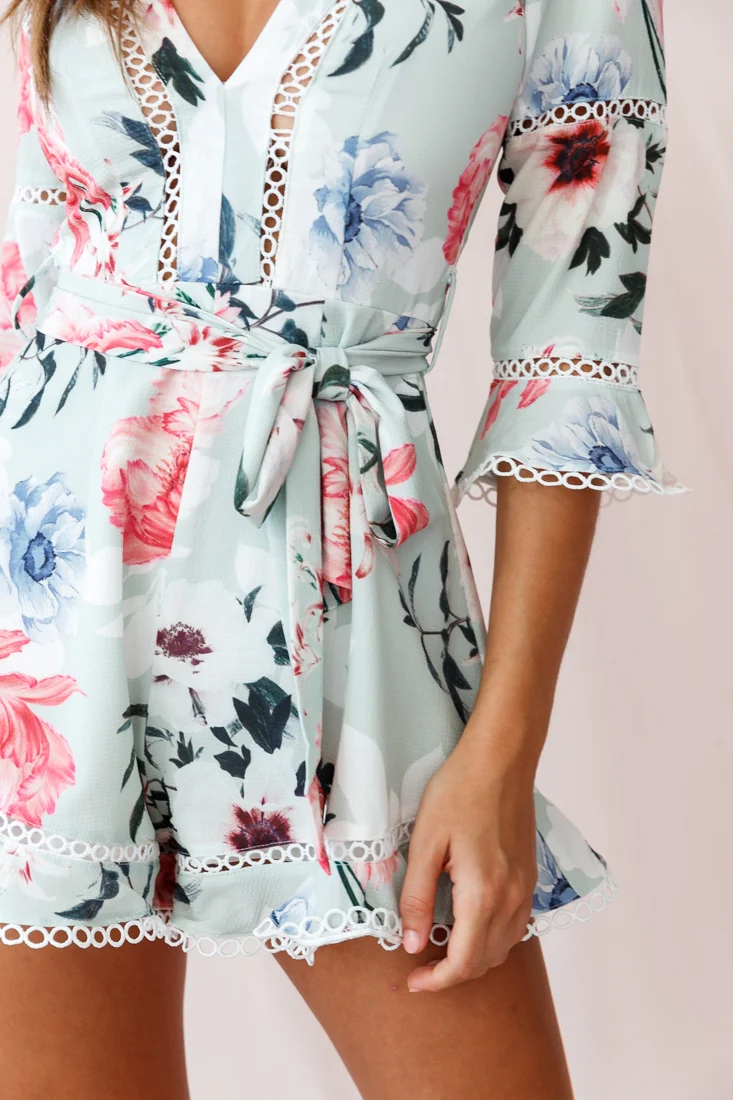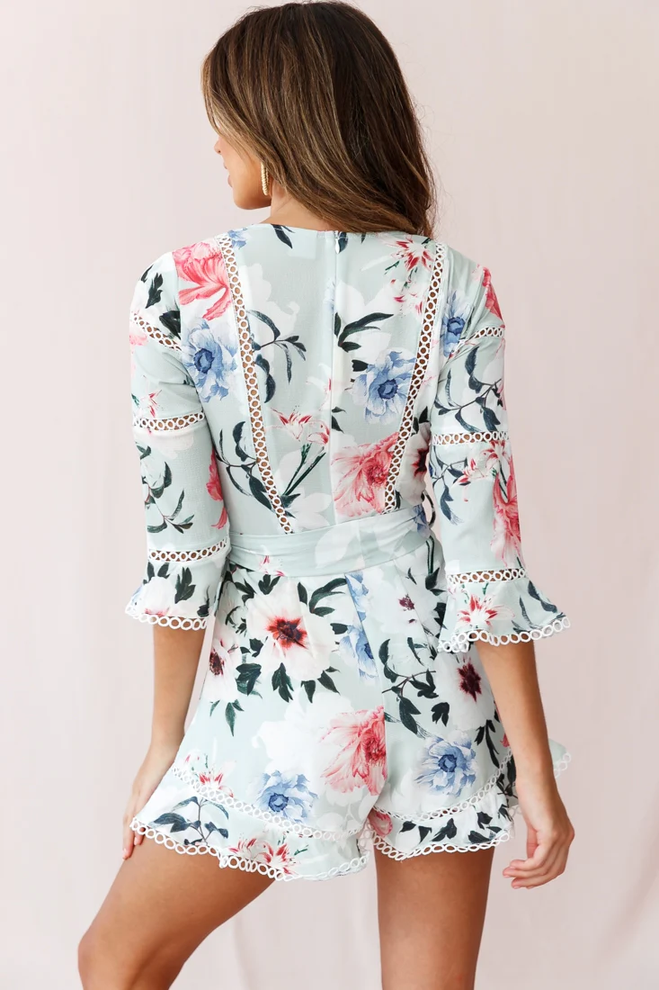 Versailles Three-Quarter Sleeve Floral Romper Green Mint