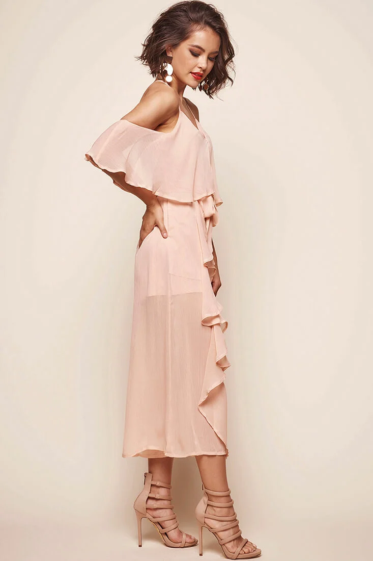 Jojo Thin Stripe Ruffle Strap Romper Beige