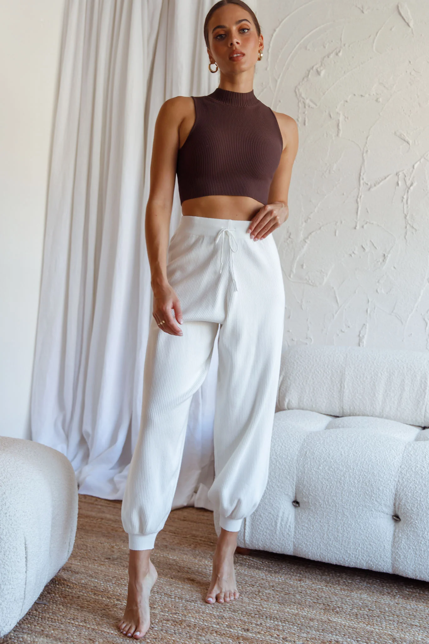 New Soul Drawstring Ribbed Knit Jogger Pants White