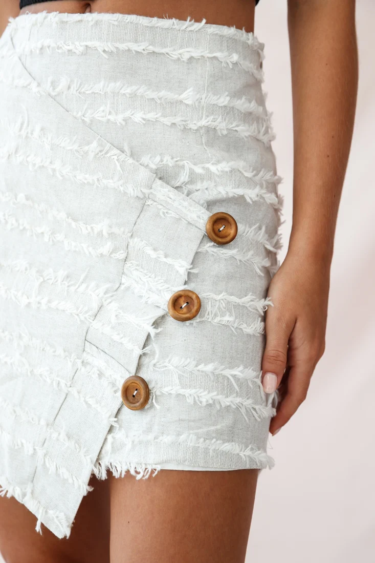 Venetian Faux Placket Frayed Wrap Mini Skirt Beige